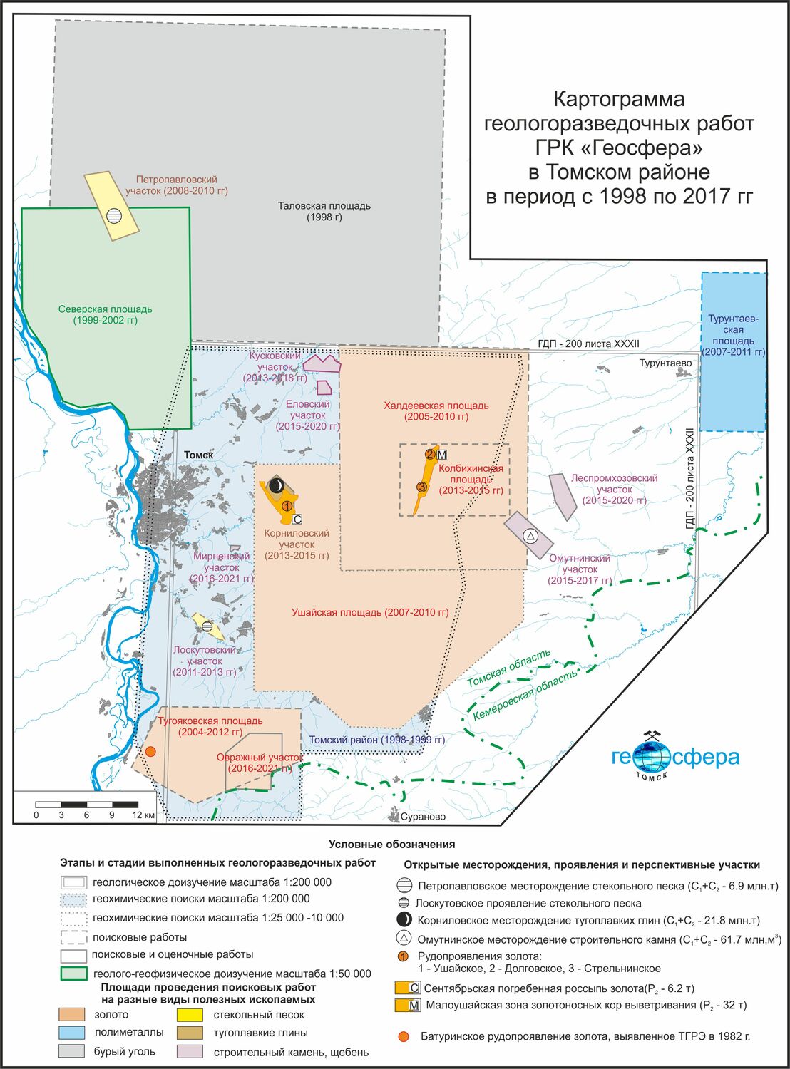 С 1998 года работы на золото в Томском районе проводила Геологоразведочная компания «Геосфера» и её дочерние предприятия. Были выполнены геохимические работы на территории всего Томского района и выделены перспективные геохимические поля. С 2003 поисковые работы Геосферой выполнялись за счёт собственных и привлечённых средств на Халдеевской и Тугояковской площадях. Но австралийским и другим инвесторам пришлось покинуть Россию после памятного экономического кризиса 2008 года.