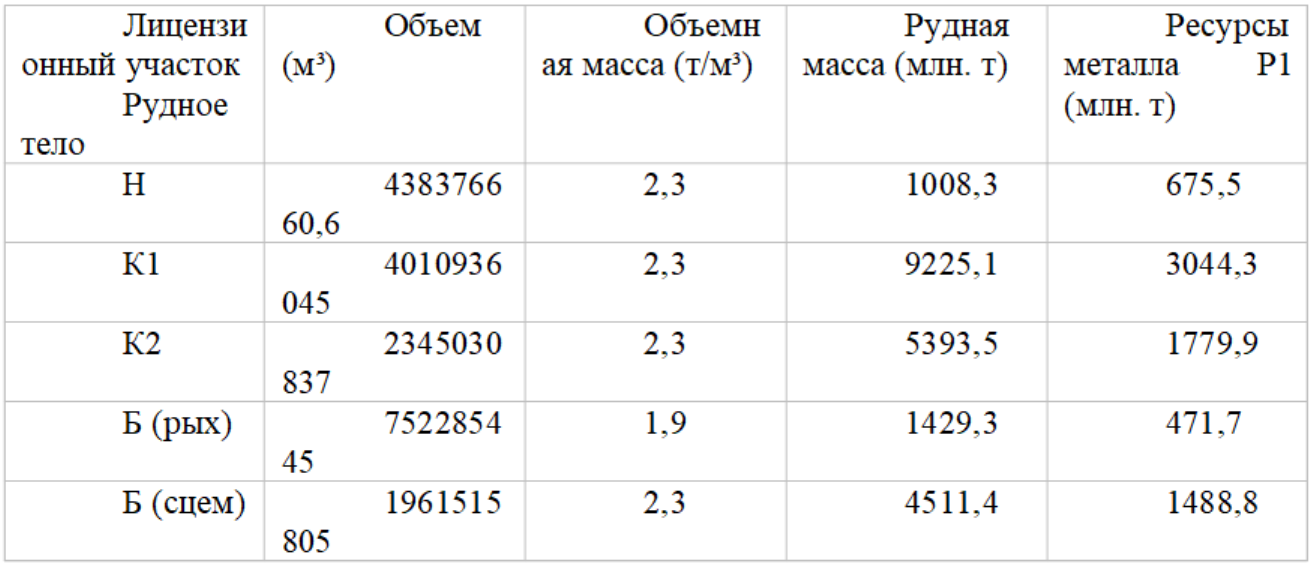 Таблица 1. Ресурсы железа в рудных залежах Бакчарского узла