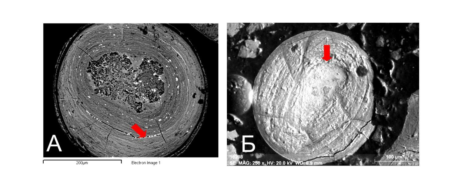 Рис. 2. Оолит гидрогетитового состава с выраженным ритмично-зональным строением, чередование ритмов подчёркивается отложениями фосфатов РЗЭ (белое на снимке)