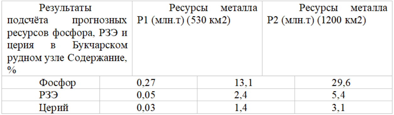 Оценка прогнозных ресурсов по фосфору, РЗЭ и церию приведена в табл. 2. Рудная масса составила 4875,9 миллиона тонн.