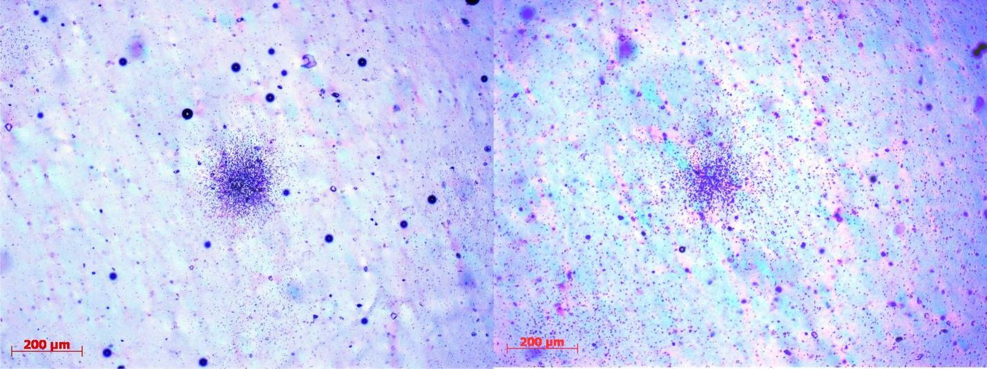Рис.3. Результаты осколочной радиографии 1 – сгущение треков над радиоактивными минералами, 2 – равномерное рассеивание радиоэлементов, проходящий свет, увеличение ×20